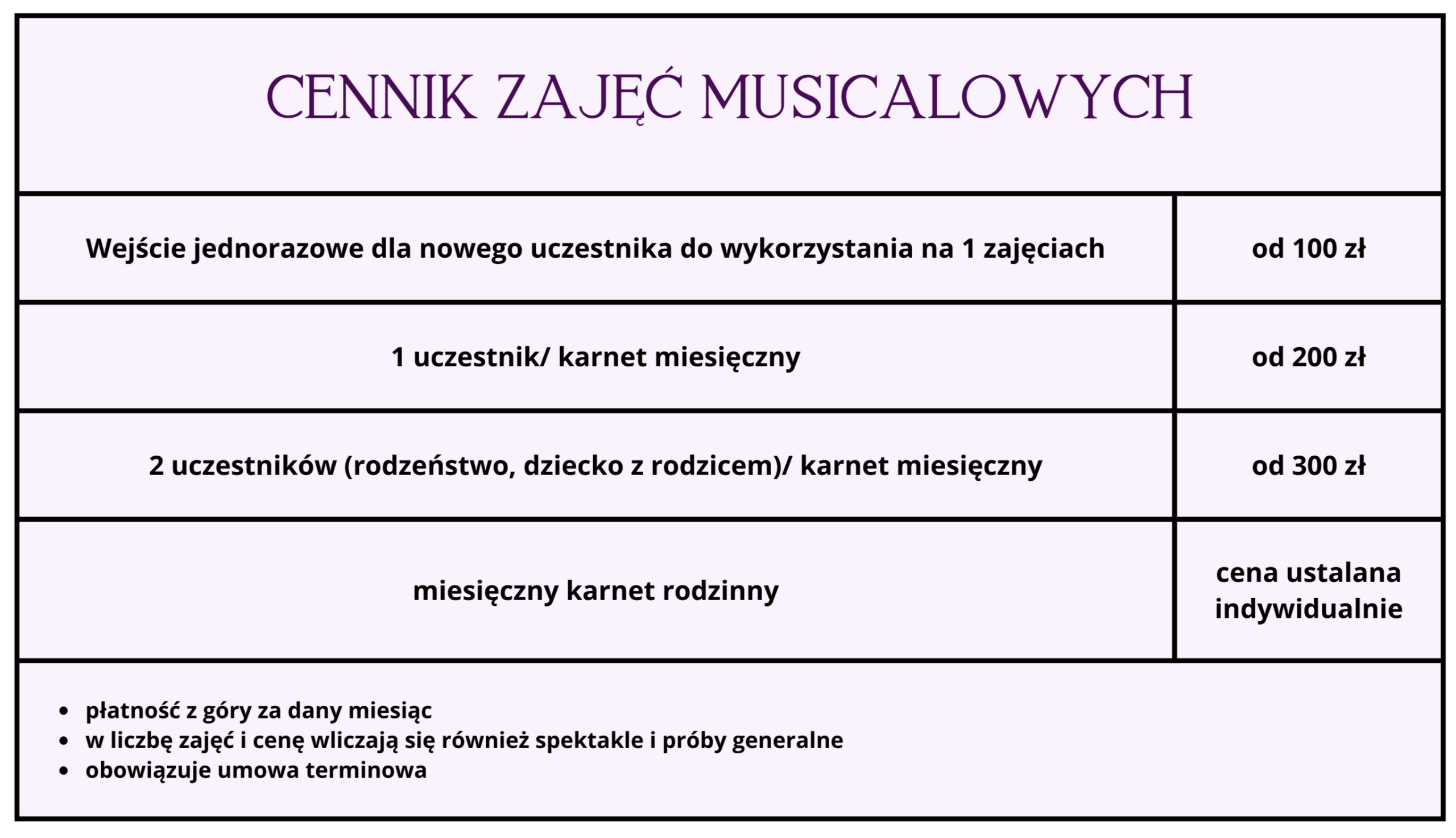 każdy z musicali niesie ze sobą przesłanie i morał. Zajęcia dedykowane są dzieciom, jak i dorosłym. Nasz program dostosowany jest do różnych grup wiekowych, aby móc wspólnie spędzać czas, rozwijać pasje i wzmacniać międzypokoleniowe relacje w inspirującej atmosferze.